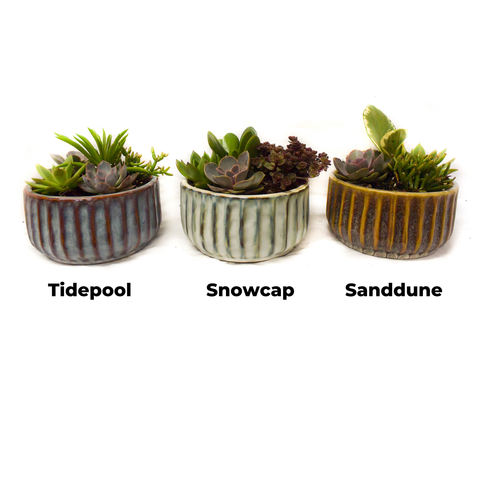 This large succulent combo is in a richly glazed ceramic container. The container has subtle variations of color as a result of the firing process that make each pot unique. At 7 inches wide it showcases a selection of 5 to 7 varieties of succulents. Choose from three different colors.