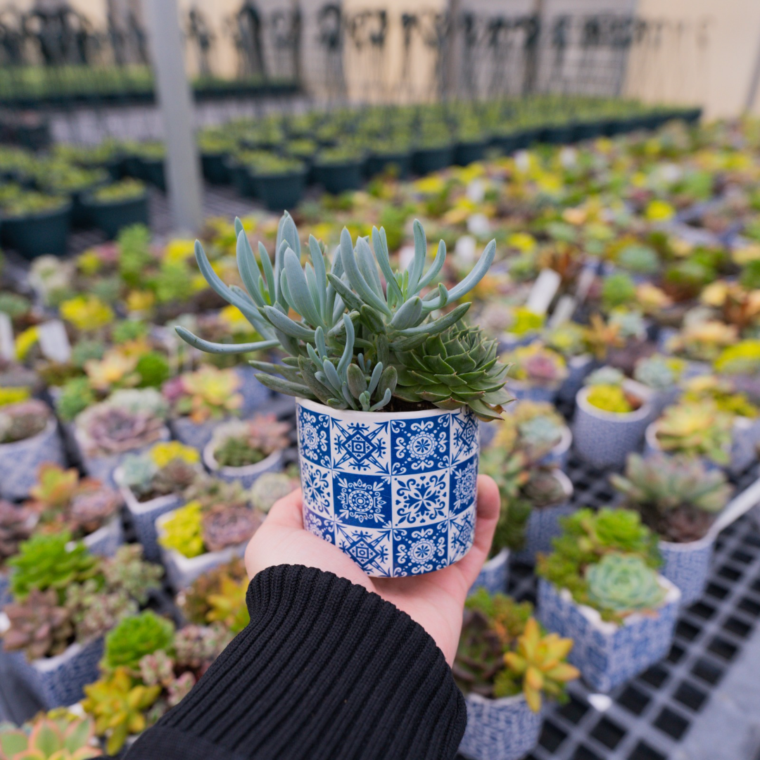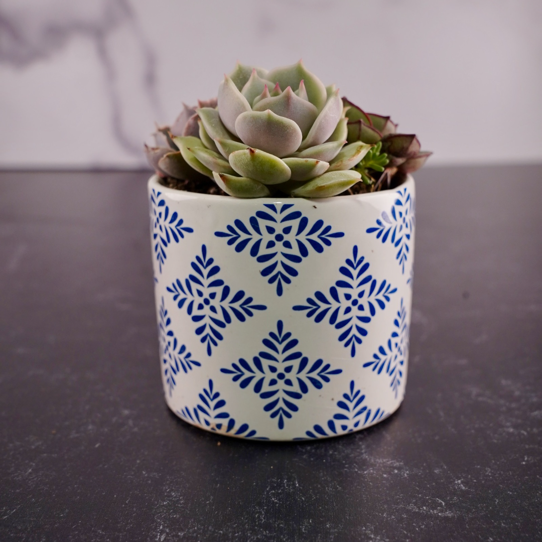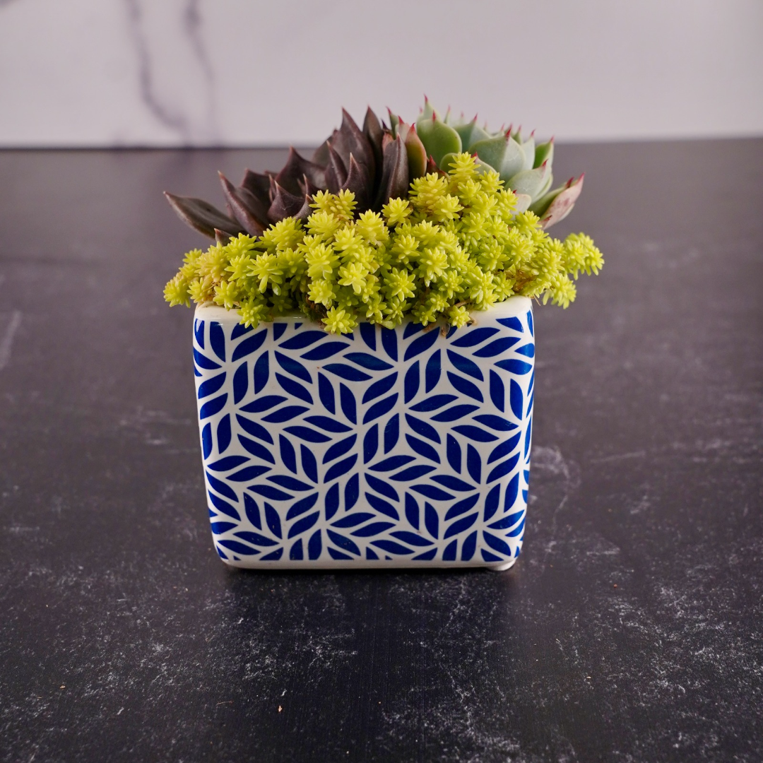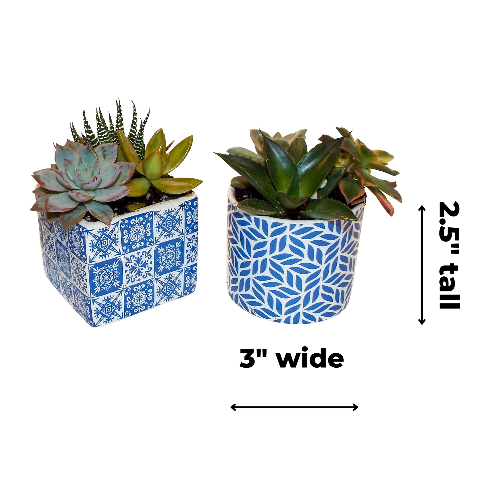 Introducing our beautiful Blue Tile Succulents! Each order includes 3 round and 3 square 3-inch pots. The ceramic pots have intricate blue tile-like designs on a white background and are planted with different succulent combinations. Each planter and arrangement is unique.