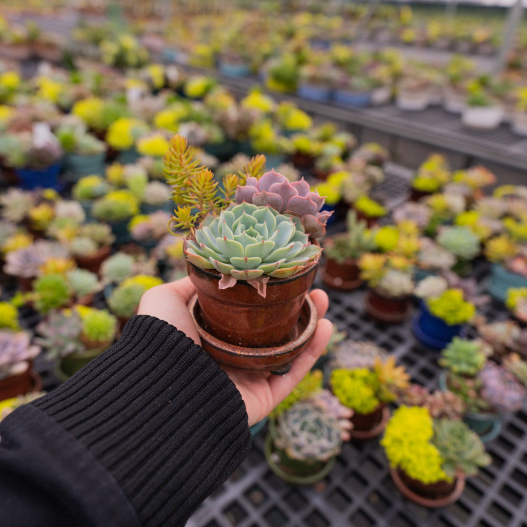 This classic flower pot is available in sets of 3 in 2 color assortments. These sturdy glazed pots have attached saucers. Each contains a combination of farm grown succulents. Choose from the cool tones of Blue-Peacock-Turquoise, or the earth tones of Copper-Green-Deep Red.