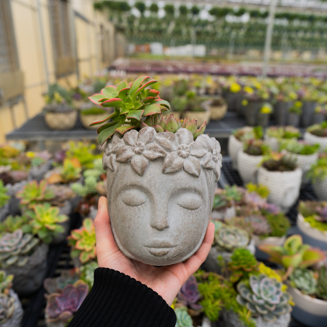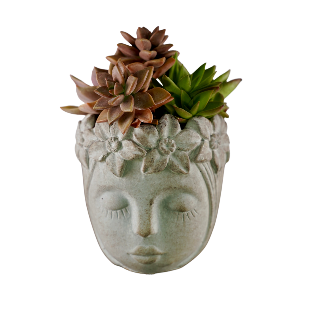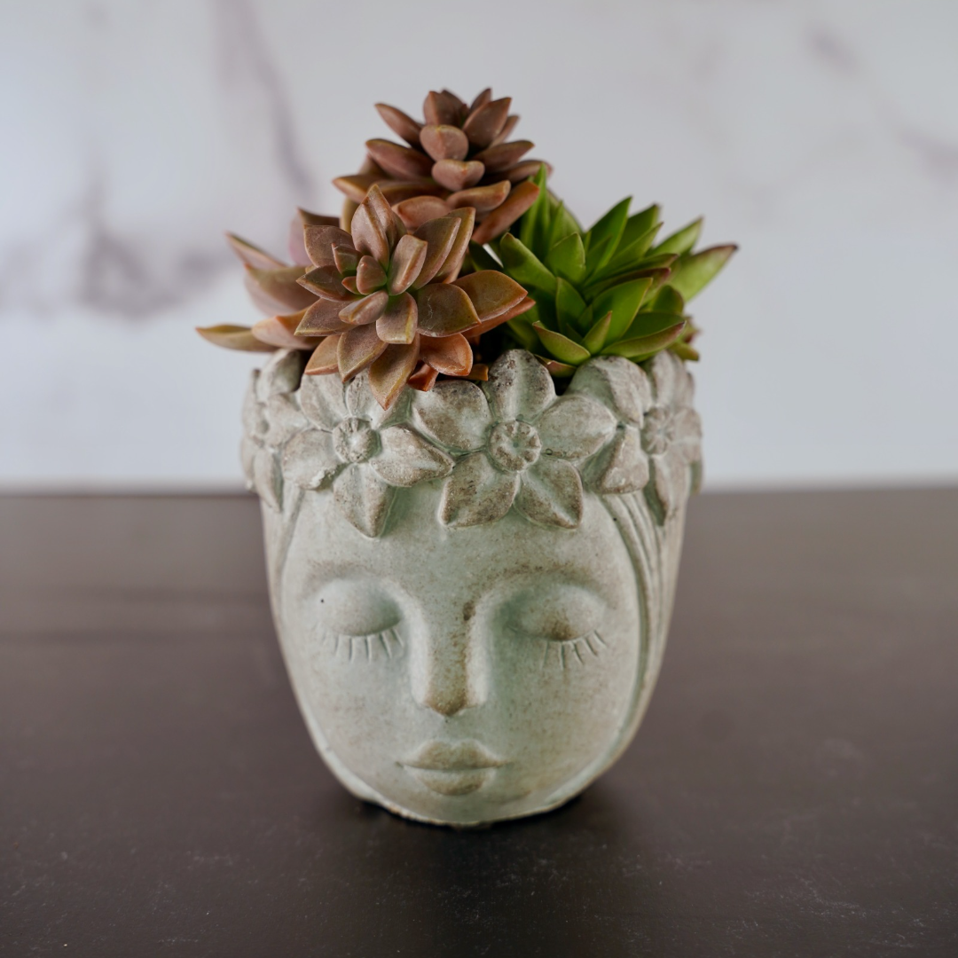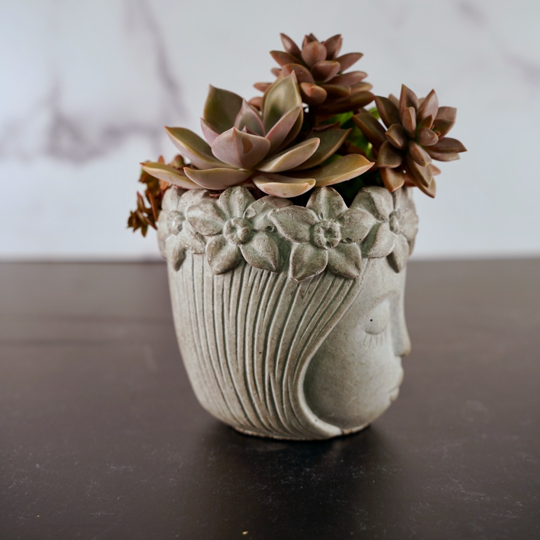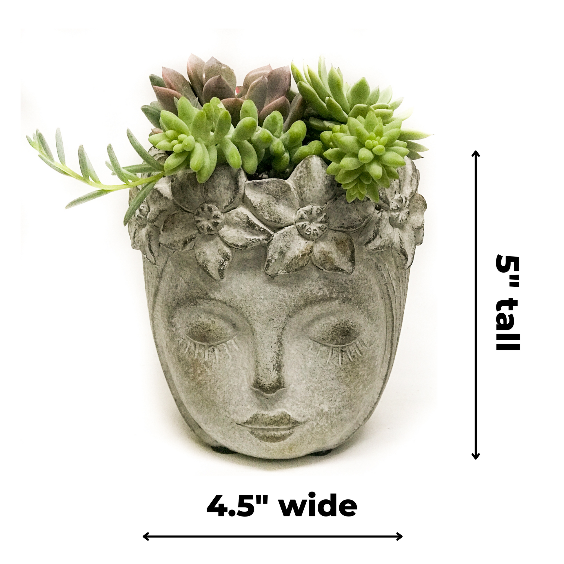 This unique, cement planter has a tranquil face and a flower crown. Copper-colored shading brings out the intricate details in the pot.