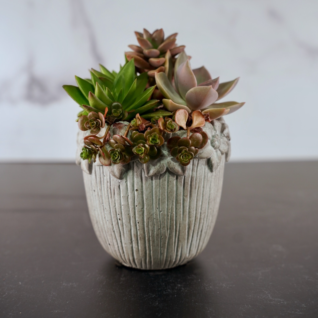 Our succulent combos contain a fresh selection of assorted plants that are in season at our nursery. They are handpicked to create unique combinations, perfect for any home, patio, or office. Succulents are easy to care for and require less work than traditional houseplants. They prefer bright light and need to dry out completely between watering. This pot does have a drainage hole.