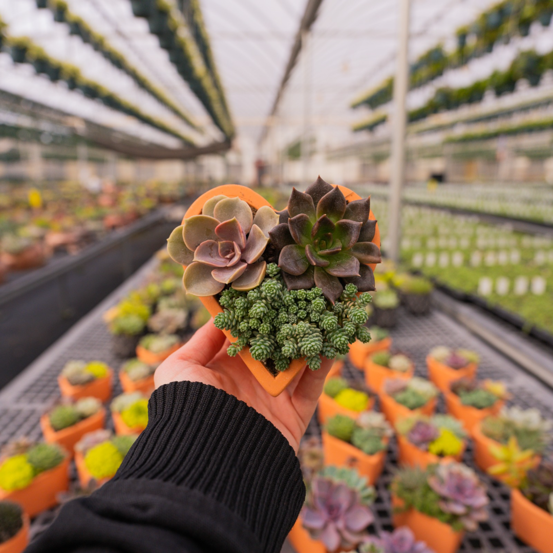 Terra cotta heart filled with easy-to-grow succulents. Each pot measures 5 inches long and 2.5 inches tall.